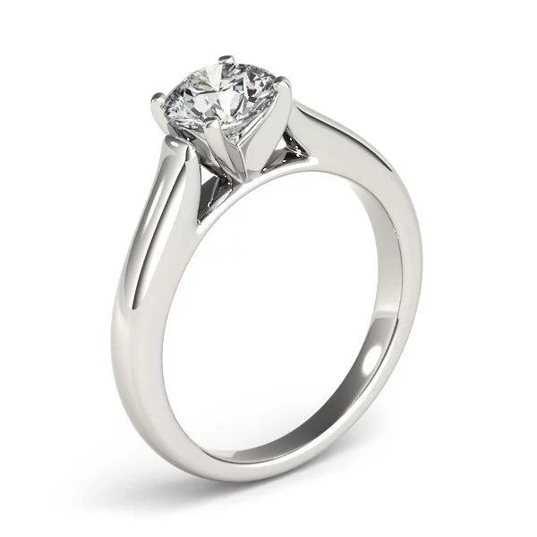 An elegant and straightforward cathedral designed round prong set solitaire ring exuding style and sophistication made of 14k white gold.